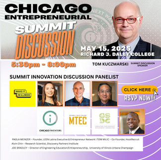 The Summit will feature a discussion moderated by Steven Meneses - Executive Director of Manufacturing Matters and MTEC, featuring four panelists: Paola Meinzer - Founder of LEEN Latina Executive & Entrepreneur Network, Joe Bradley - Director of Engineering Education/Entrepreneurship at University of Illinois Urbana-Champaign, Tom Milic - Co-Founder of HootRecruit, and Alvin Chin - Research Scientist at Discovery Partners Institute.